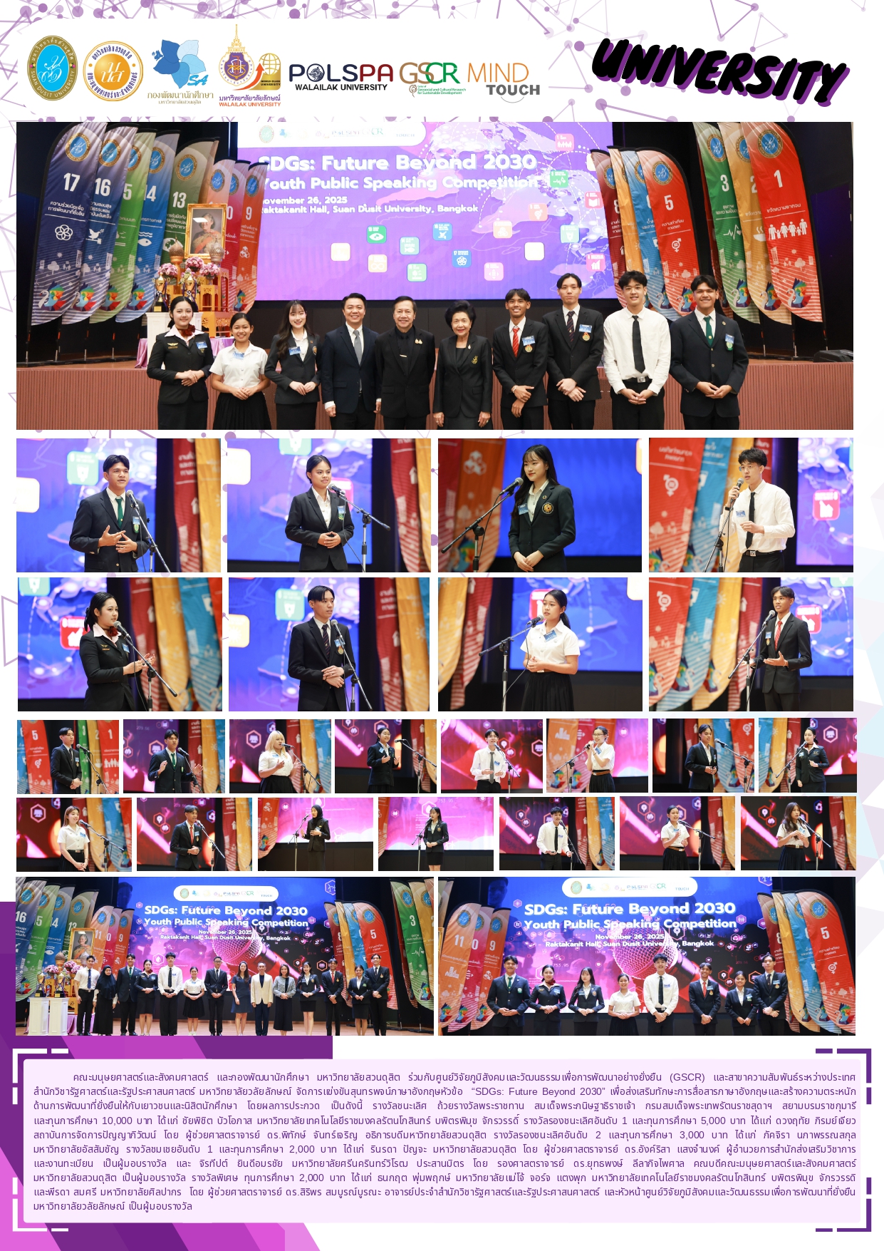 คณะมนุษยศาสตร์และสังคมศาสตร์ และ กองพัฒนานักศึกษา มหาวิทยาลัยสวนดุสิต ร่วมกับ ศูนย์วิจัยภูมิสังคมและวัฒนธรรมเพื่อการพัฒนาอย่างยั่งยืน (GSCR) และ สาขาความสัมพันธ์ระหว่างประเทศ สำนักวิชารัฐศาสตร์และรัฐประศาสนศาสตร์ มหาวิทยาลัยวลัยลักษณ์ ในช่วงบ่ายเป็นการแข่งขันรอบชิงชนะเลิศ (Final Round – Impromptu Speech) มอบรางวัล และพิธีปิดโครงการฯ โดยได้รับเกียรติจาก ผู้ช่วยศาสตราจารย์ ดร.พิทักษ์ จันทร์เจริญ อธิการบดีมหาวิทยาลัยสวนดุสิต เป็นประธานปิดโครงการ หอประชุมรักตะกนิษฐ ชั้น 2 โดยผลการประกวดสุนทรพจน์ภาษาอังกฤษหัวข้อ “SDGs: Future Beyond 2030” เป็นดังนี้