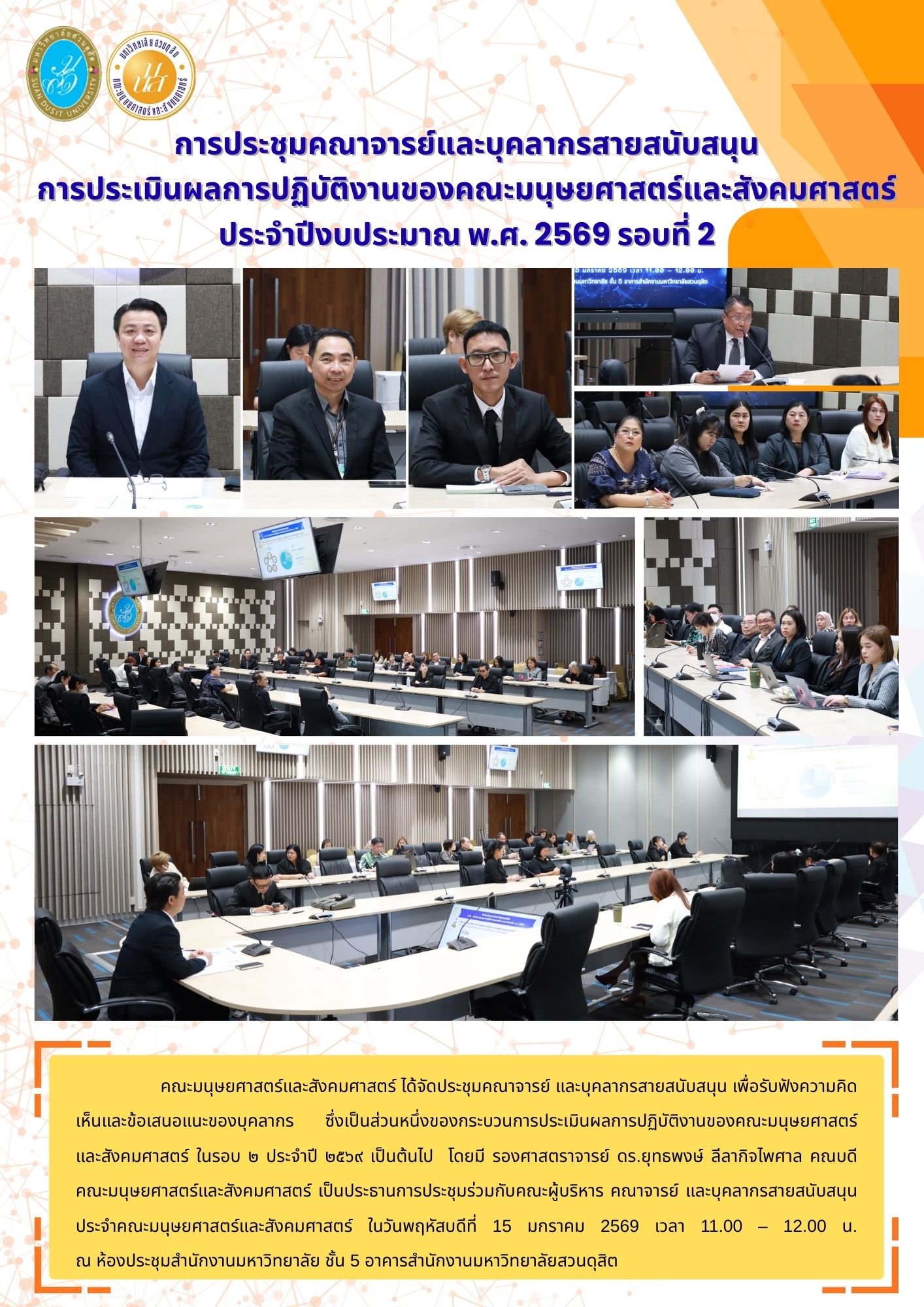 คณะมนุษยศาสตร์และสังคมศาสตร์ ได้จัดประชุมคณาจารย์ และบุคลากรสายสนับสนุน เพื่อรับฟังความคิดเห็นและข้อเสนอแนะของบุคลากร ซึ่งเป็นส่วนหนึ่งของกระบวนการประเมินผลการปฏิบัติงานของคณะมนุษยศาสตร์และสังคมศาสตร์ ในรอบ ๒ ประจำปี ๒๕๖๙ เป็นต้นไป โดยมี รองศาสตราจารย์ ดร.ยุทธพงษ์ ลีลากิจไพศาล คณบดีคณะมนุษยศาสตร์และสังคมศาสตร์ เป็นประธานการประชุมร่วมกับคณะผู้บริหาร คณาจารย์ และบุคลากรสายสนับสนุน ประจำคณะมนุษยศาสตร์และสังคมศาสตร์ ในวันพฤหัสบดีที่ 15 มกราคม 2569 เวลา 11.00 – 12.00 น. ณ ห้องประชุมสำนักงานมหาวิทยาลัย ชั้น 5 อาคารสำนักงานมหาวิทยาลัยสวนดุสิต