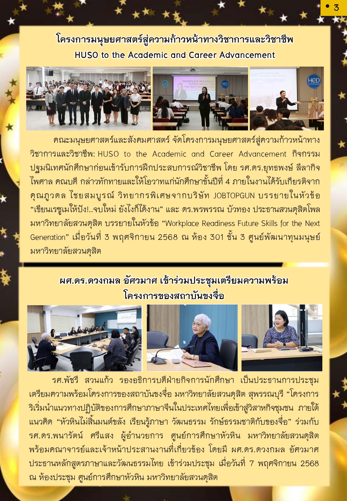 กิจกรรมปฐมนิเทศนักศึกษาก่อนเข้ารับการฝึกประสบการณ์วิชาชีพ ในหัวข้อ“The Happiness and Success Journey” โครงการมนุษยศาสตร์สู่ความก้าวหน้าทางวิชาการและวิชาชีพ HUSO to the Academic and Career Advancement